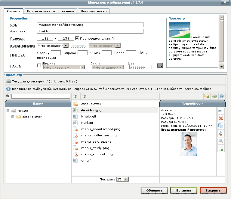 Кнопки Обновить, Вставить, Закрыть позволяют обновить список содержимого Библиотеке изображений, вставить выбранный элемент или закрыть менеджер.