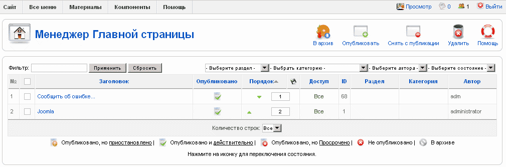 Менеджер позволит Вам редактировать материалы, размещенные на главной странице, убирать их с размещения и изменять порядок отображения. Помимо этого, менеджер обладает тем же функционалом, что и менеджер материалов, рассмотренный нами ранее.
