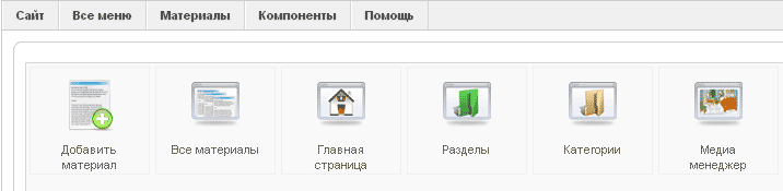 Кроме того, в Панели управления имеется строка меню (Основное меню): Сайт, Все меню, Материалы, Компоненты, Помощь.