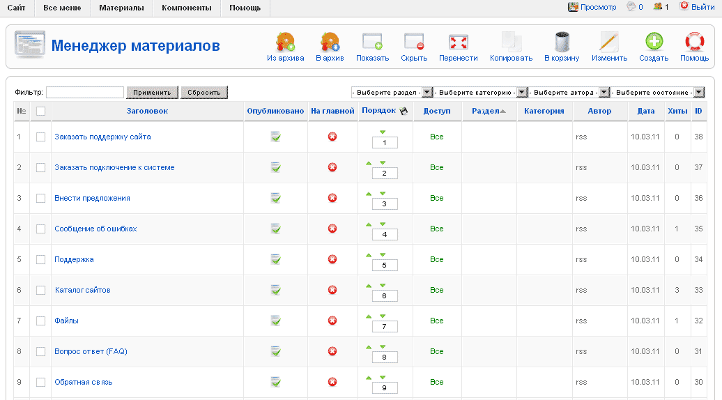 Материалы – основная кузница контента. Все четыре менеджера предназначены для создания, удаления, редактирования и управления соответствующими уровнями структурирования, хранения и публикаций информации. Подробнее в разделе «Начало работы».