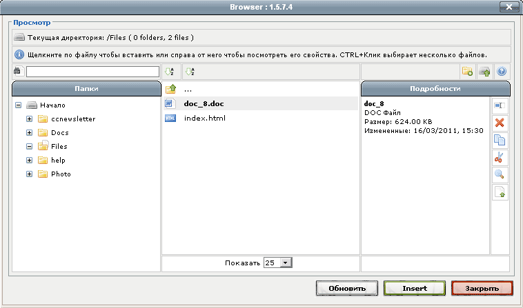 Кнопки Обновить, Вставить, Закрыть позволяют обновить список содержимого Библиотеке изображений, вставить выбранный элемент или закрыть менеджер.